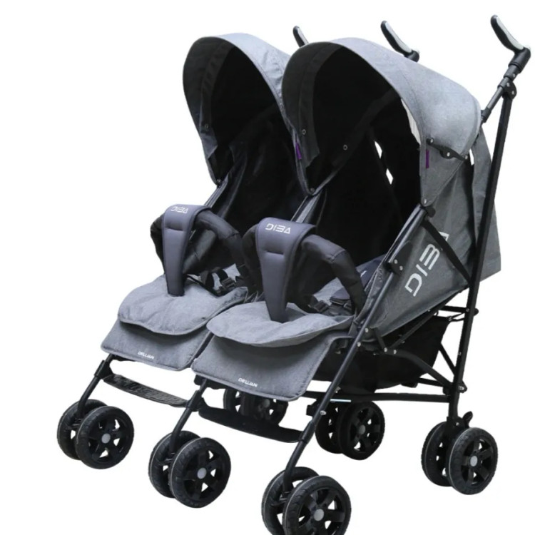 کالسکه دوقلو دیبا پلاس از شرکت دلیجان جنس بدنه فلز چرخ های روان قابلیت جمع شدن به صورت عصایی تاشو مشکی و طوسی.
