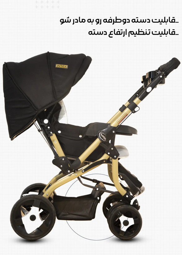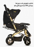 کالسکه بدنه طلایی پارچه مشکی سرمه ای طوسی قهوه ای صورتی کرم : دسته رو به مادر میشه چرخ عقب بزرگ چرخ جلو ۳۶۰ درجه